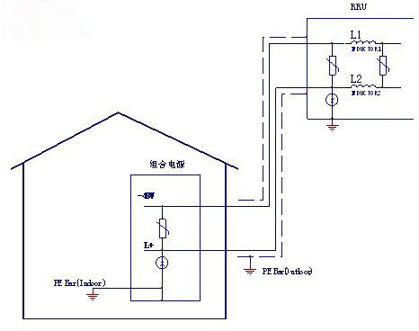 注:① 如果組合電源內(nèi)部沒(méi)有配置合適的直流防雷器,則應(yīng)該在RRU電源線引出機(jī)房處加裝一級(jí)直流防雷箱;