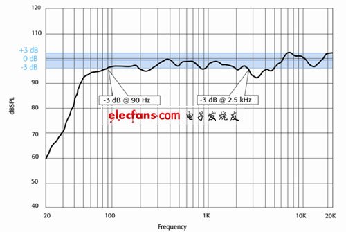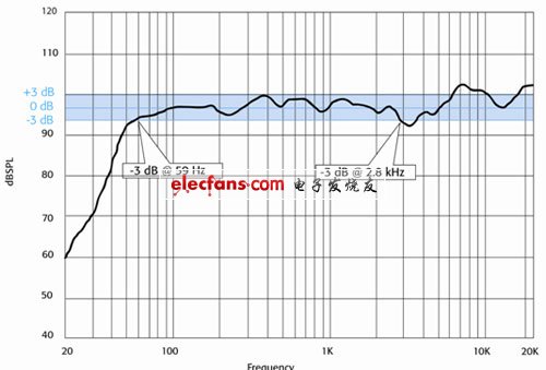 如果說+/-3dB所表示的是平坦特性,而不是頻率響應(yīng)范圍,那么這個參數(shù)對頻率特性而言還有什么意義?回答這個問題前我們可以看一下制造商在典型揚聲器說明書上所標(biāo)注的“+/-3dB頻響。”