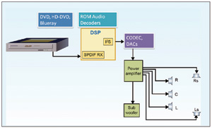 利用多聲道、多揚(yáng)聲器系統(tǒng)和先進(jìn)的音頻算法,音頻系統(tǒng)能夠惟妙惟肖地模擬真實聲音。這些復(fù)雜的音頻系統(tǒng)使用ASIC或DSP來解碼多聲道編碼音頻,并且運(yùn)行各種后處理算法。聲道數(shù)量越多,意味著存儲器和帶寬要求越高,這就需要使用音頻數(shù)據(jù)壓縮技術(shù)來編碼并減少所要存儲的數(shù)據(jù)。這些技術(shù)還能用來保持聲音質(zhì)量。