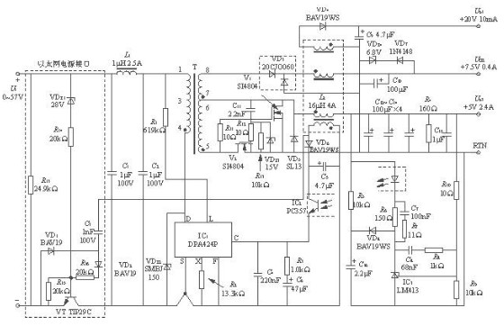 該電源以5V輸出作為主輸出,其他兩路輸出都是在此基礎(chǔ)上獲得的。由C11,R11,R12和MOS場效應(yīng)管V2及V1構(gòu)成5V主輸出的電容耦合式同步整流器。穩(wěn)壓管VDZ3起箝位作用。在沒有開關(guān)信號時(shí),通過下拉電阻R13使V2關(guān)斷。儲能電感L2回掃繞組的電壓經(jīng)過VD4和C9整流濾波后,獲得20V輸出。高頻變壓器次級繞組(8-5)的電壓經(jīng)過VD3和C10整流濾波后獲得7.5V輸出。將6.8V穩(wěn)壓管VDZ4和二極管VD7反極性串聯(lián)后作為7.5V輸出的負(fù)載電阻,以改善空載穩(wěn)壓特性??蛰d時(shí)輸出電壓一旦超過7.5V,VDZ4就被反向擊穿,利用VDZ4和VD2上的壓降可將輸出電壓箝制在大約7.5V上。正常工作時(shí),輔助繞組的輸出電壓經(jīng)過VD6、C5整流濾波后給光耦合器PC357提供12~15V的偏壓。R5、VD8和C16組成軟啟動電路,能防止在啟動過程中輸出過沖。