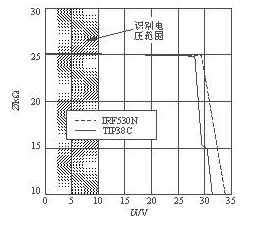 如圖4所示為使用MOSFET(V3)的開關(guān)電路。VDZ4及VDZ5分別采用28V及15V穩(wěn)壓管。當(dāng)輸入電壓超過28V時(shí)VDZ4被反向擊穿,使V3導(dǎo)通,將電源開啟。當(dāng)輸入電壓超過43V時(shí)VDZ5也被反向擊穿,能限制V3的柵-源電壓,起到保護(hù)作用。R15能防止V3被誤導(dǎo)通。該以太網(wǎng)電源模塊的識別信號阻抗與輸入電壓的關(guān)系曲線如圖5所示,識別電壓范圍是2.5~10V。