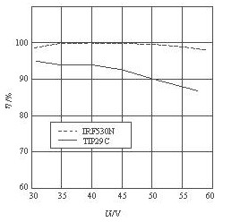 該電源模塊的電源效率與輸入電壓的關(guān)系曲線如圖6所示。