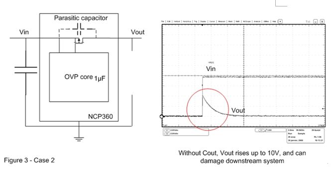 在圖3的案例2中,輸出電容已被移除。這樣,當OVP器件輸入端出現(xiàn)快速輸入瞬態(tài)現(xiàn)象時,旁路元件將保持開路。這時可以在輸出端觀察到過 沖,這個過沖可能會損壞連接至OVP輸出端的電子元器件。為了解決這個問題,必須在輸出引腳上連接一個輸出電容,并盡量靠近OVP器件擺放。