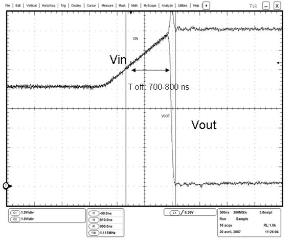 OVP器件的關(guān)閉時間從突破OVLO閥值開始算到Vout引腳下降為止。NCP360盡管消耗電流極低,但具有極快的關(guān)閉時間。典型值700ns/最大值1.5μs的關(guān)閉時間使得該器件成為當今市場上一流的器件,如圖5所示。