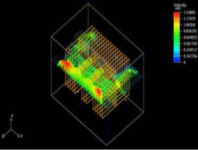 盡管散熱器的參數(shù)優(yōu)化對溫升控制略有改善,但仍不能滿足功率管的可靠性要求,因此,我們考慮強迫風冷的散熱方式。在上述計算模型的基礎上,我們在垂直方向設定流體的流速為1.5m/s , 即在散熱器底部送風,其他參數(shù)不變。我們注意到,此時系統(tǒng)給出的流態(tài)為紊流。在初始條件中作相應的調整后,最終求得的器件表面最高溫度約為89°C。散熱器底板截面溫度圖及橫向風速云圖分別見圖2、3。