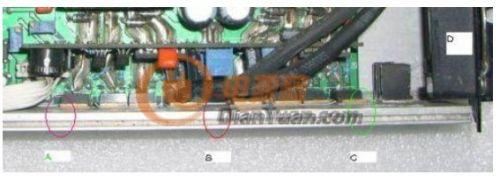 攝氏25度環(huán)境時,輸出滿載1000W,10分鐘后圖片B處(8個MOS管的中心位置)的溫度比A處高出6~8度!C處(綠圈)最低,比B處低14~15度?。–處為進風口,D為風扇,樣機為進風設計,據(jù)說是用以延長含油軸承的壽命),同樣型號并聯(lián)工作的功率MOS管,實際工作的溫差那么大,自然對“均流”是極其不利!所以可靠性不高就不足為怪了。
