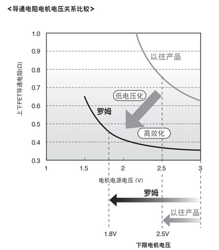 為了滿足這些需求,為改善驅(qū)動(dòng)效率需要提高開關(guān)速度和降低導(dǎo)通電阻,另外,為抑制消耗電流需要減少開關(guān)晶體管的柵極驅(qū)動(dòng)用升壓電路(電荷泵電路)。但是,為了提高開關(guān)速度的高速化所需要的預(yù)驅(qū)動(dòng)器的能力,按照以往的技術(shù),需要提高預(yù)驅(qū)動(dòng)器中的電流,從而成為低功耗化的瓶頸。另外,以往產(chǎn)品的工作電壓范圍,特別是在低電壓范圍(3V以下)無法確保所需要的柵極電壓,因此,電荷泵電路必不可缺。這次羅姆為了解決這些低功耗化的問題,將最先進(jìn)的DMOS工藝與獨(dú)創(chuàng)的電路技術(shù)相融合,同時(shí)實(shí)現(xiàn)了低消耗電流下的高速驅(qū)動(dòng)和無電荷泵下的達(dá)1.8V的低電壓驅(qū)動(dòng)。由此,實(shí)現(xiàn)了業(yè)界最短的導(dǎo)通、關(guān)斷時(shí)間和寬范圍的工作電壓,使得移動(dòng)設(shè)備長(zhǎng)時(shí)間驅(qū)動(dòng),在10V以上電源的家電產(chǎn)品中的使用成為可能。另外,封裝上也實(shí)現(xiàn)了小尺寸,而且,由于無需電荷泵,至少可以節(jié)省2個(gè)電容器,為系統(tǒng)的小型化做出了貢獻(xiàn)。