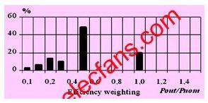 對(duì)于傳統(tǒng)電力電子裝置的設(shè)計(jì),我們通常是通過(guò)每千瓦多少錢(qián)來(lái)衡量其性?xún)r(jià)比的。但是對(duì)于光伏逆變器的設(shè)計(jì)而言,對(duì)最大功率的追求僅僅是處于第二位的,歐洲效率的最大化才是最重要的。因?yàn)閷?duì)于光伏逆變器而言,不僅最大輸出功率的增加可以轉(zhuǎn)化為經(jīng)濟(jì)效益,歐洲效率的提高同樣可以,而且更加明顯。歐洲效率的定義不同于我們通常所說(shuō)的平均效率或者最高效率。它充分考慮了太陽(yáng)光強(qiáng)度的變化,更加準(zhǔn)確地描述了光伏逆變器的性能。歐洲效率是由不同負(fù)載情況下的效率按照不同比重累加得到的,其中半載的效率占其最大組成部分(見(jiàn)圖1)。