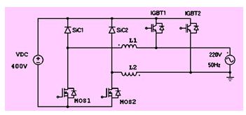在圖13中,上橋臂igbt的開(kāi)關(guān)頻率一般設(shè)定為電網(wǎng)頻率(例如50hz),而下橋臂的mosfet則工作在較高的開(kāi)關(guān)頻率下,例如 16khz,來(lái)實(shí)現(xiàn)輸出正弦波。仿真顯示,這種逆變器拓?fù)湓?kw額定功率輸出時(shí),效率可以達(dá)到99.2%。由于mosfet內(nèi)置二極管的速度較慢,因此 mosfet不能被用在上橋臂。