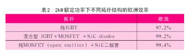 圖16所示拓?fù)浣Y(jié)構(gòu)允許純無(wú)功負(fù)載,能夠提高對(duì)電網(wǎng)的無(wú)功補(bǔ)償,也能滿(mǎn)足雙向功率流動(dòng),例如實(shí)現(xiàn)高效電池充電。如果應(yīng)用sic肖特基二極管,這種電路拓?fù)鋵⒖梢赃_(dá)到更高的效率等級(jí)。表2是2kw額定功率下不同拓?fù)浣Y(jié)構(gòu)的歐洲效率