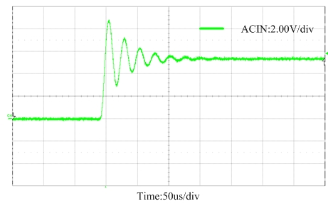 而在適配器熱插拔時,也會出現(xiàn)瞬態(tài)的過壓電壓,由于適配器連接線的寄生電感效應(yīng),熱插拔時會產(chǎn)生瞬態(tài)的輸出振蕩波形,經(jīng)過一段時間的衰減后會穩(wěn)定在DC值。圖2為5.5V適配器熱插拔時的瞬態(tài)波形,通常適配器熱插拔時產(chǎn)生的瞬態(tài)過壓峰值電壓是其DC值的兩倍左右。