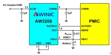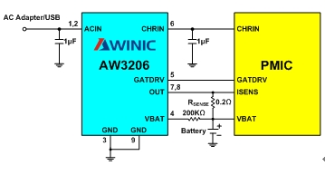 AW3206和AW3208的輸入引腳ACIN到地需要一個不小于1uF的輸入電容。這個輸入電容除了去耦外,還可以有效減小適配器在熱插拔時由于連接線的寄生電感效應(yīng)產(chǎn)生的瞬態(tài)過沖電壓。另外這個電容建議選取耐壓不低于15V的X7R或X5R陶瓷電容。