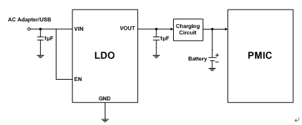 但在標(biāo)準的諾基亞適配器中,有很大一部分適配器的輸出電壓是高于7V的,圖3是諾基亞適配器AC-3C的輸出特性曲線,從圖中可以看出,AC-3C的輸出電壓在空載時為7.5V,而有的諾基亞充電器的輸出電壓會高達8~9V。為了適應(yīng)諾基亞適配器,曾有如圖5所示的用高壓LDO設(shè)計的手機充電系統(tǒng)方案: