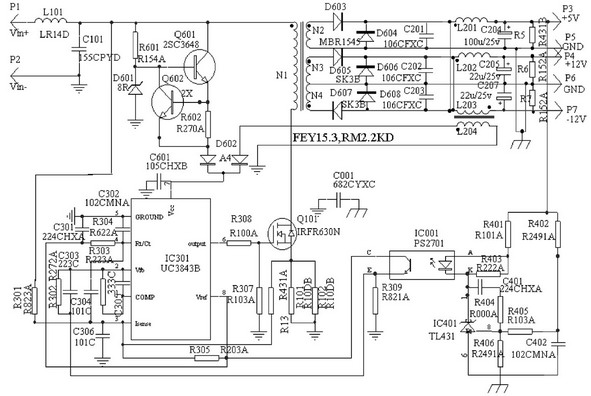 電源工作原理為:電路采用單端正激變換電路,當(dāng)變換器接通電源時(shí),輸入直流電壓經(jīng)由電阻、12V穩(wěn)壓管D601和三極管Q601、Q602組成的電路穩(wěn)壓降壓后, 啟動(dòng)UC3843進(jìn)入正常工作,偏置繞組L204的供電電路開(kāi)始工作,輸出經(jīng)A4和C601整流及濾波后輸出12V電壓,高于自供電電壓,使二極管A4反偏,啟動(dòng)電路停止工作。變換器進(jìn)入正常工作后,電源依據(jù)PWM脈寬調(diào)制方式工作,次級(jí)繞組的輸出經(jīng)過(guò)二極管整流以及電容器和電感器組成的LC型濾波器濾波后,產(chǎn)生所需的各路輸出直流電壓。+5V的輸出電壓由電阻器R402和R406分壓后,與可編程穩(wěn)壓源TL431(U3)中的2.5V參考電壓比較,然后通過(guò)光耦合器U2反饋到UC3843的2腳,控制脈沖的占空比,穩(wěn)定5V輸出。耦合電感L202和L203實(shí)現(xiàn)+/-12V兩路穩(wěn)壓。過(guò)流保護(hù)電阻R101、R102檢測(cè)到開(kāi)關(guān)管的過(guò)流信號(hào),送入3843的3腳,封鎖UC3843的輸出信號(hào),實(shí)現(xiàn)過(guò)流保護(hù)。