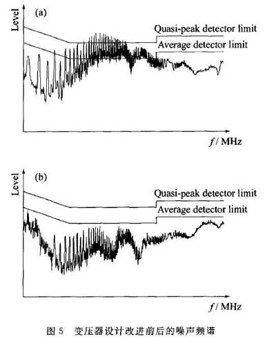 圖5為變壓器設(shè)計改進前后實驗樣品的傳導噪聲頻譜對比。