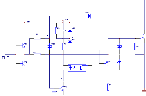 正常工作時(shí),因故障檢測二極管VD1的導(dǎo)通,將a點(diǎn)的電壓鉗位在穩(wěn)壓二極管VZ1的擊穿電壓以下,晶體管VT1始終保持截止?fàn)顟B(tài)。當(dāng)電路發(fā)生過流或短路故障時(shí),V1上的uce上升,a電壓隨之上升,到一定值時(shí),VZ1擊穿,VT1通,b點(diǎn)電壓下降,電容C1通過電阻R1充電,電容電壓從零開始上升,當(dāng)電容電壓上升約1.4V時(shí),晶體管VT2開通,柵極電壓uge隨電容電壓的上升而下降,通過調(diào)節(jié)C1的數(shù)值,可控制電容的充電速度,進(jìn)而控制uge的下降速度;當(dāng)電容電壓上升到穩(wěn)壓二極管VZ2的擊穿電壓時(shí),VZ2擊穿,uge被鉗位在一固定的數(shù)值上,慢降柵壓過程結(jié)束,同時(shí)驅(qū)動(dòng)電路通過光耦輸出過流信號(hào)傳送至單片機(jī),此時(shí)單片機(jī)發(fā)出聲光報(bào)警并開始運(yùn)行延時(shí)程序。如果在單片機(jī)的延時(shí)過程中,故障信號(hào)消失了,則a點(diǎn)電壓降低, VT1恢復(fù)載止,C1通過R2放電,d點(diǎn)電壓升高,VT2也恢復(fù)截止,uge上升,電路恢復(fù)正常工作狀態(tài),單片機(jī)自動(dòng)進(jìn)行復(fù)位。如果單片機(jī)在延時(shí)結(jié)束后,故障信號(hào)仍存在則由單片機(jī)切斷所有IGBT的輸入脈沖,設(shè)備停止工作,此時(shí)要通過手動(dòng)復(fù)位才能恢復(fù)正常工作。這種電路既能保護(hù)逆變電路和IGBT的安全,又不會(huì)在瞬時(shí)過流時(shí)中斷逆變電源工作所以是一種非常有效的保護(hù)方式。