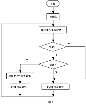 在此硬件電路的基礎(chǔ)上,結(jié)合單片機(jī)的控制系統(tǒng)可檢測輸出電壓低于某一設(shè)定值時(shí),單片機(jī)便認(rèn)為負(fù)載電弧是處于短路狀態(tài),這時(shí)單片機(jī)便對IGBT的最小脈沖寬度進(jìn)行限制,以保證吸收電容有足夠的放電時(shí)間,從而降低IGBT的關(guān)斷反向電壓。同時(shí)為保證輸出電流恒定,單片機(jī)在判斷輸出為短路時(shí)將逆變器的等脈沖寬度調(diào)節(jié)(PWM)變?yōu)轭l率調(diào)節(jié)控制(PFM),即脈沖分頻控制,輸出電壓越低,輸出脈沖的頻率越低。其單片機(jī)程序過程如圖5所示: