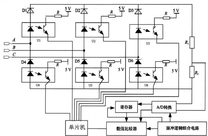 傳統(tǒng)的檢測電路設(shè)計:圖2是一種傳統(tǒng)的數(shù)字型自然換相點檢測電路的原理圖,其中占用了7個I/O口,并且還需要ADC、數(shù)值寄存器和脈沖邏輯組合電路。電路相當復(fù)雜,在程序設(shè)計上也需要進行設(shè)計以后才能對自然換相點作出判斷。另外這種方法還存在換相點丟失的情況,丟失的概率會隨采樣頻率的降低而增大,極大降低了控制的可靠性。