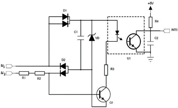 當u 1 >u 2 時,穩(wěn)壓管兩端電壓為5V,電容C1充電,由于C1容值較小。而u 1>u 2 的時間為半個周期,即0.01s,足以保證電容C1充電完成,此時并聯(lián)在三極管Q1基射極兩端的的二極管提供鉗位電壓,使得三極管工作在截止區(qū),光耦U1的控制二極管不導(dǎo)通,受控三極管截止,單片機外部INT0拉至高電平,當經(jīng)過a點后,u 2>u 1 ,U2為三極管Q1提供基極電壓,同時電容C1提供集射極電壓,三極管Q1導(dǎo)通,在這段時間內(nèi),C1、控制二極管、R3、Q1形成回路,光耦U1中的受控三極管導(dǎo)通,單片機外部中斷INT0下拉至低電平,在這個過程中,單片機對這個下降沿進行捕捉,實現(xiàn)對u1、u2兩相交點a進行檢測,光耦U1實現(xiàn)了輸入端和輸出端的電氣隔離,同時提高了系統(tǒng)的抗干擾能力。