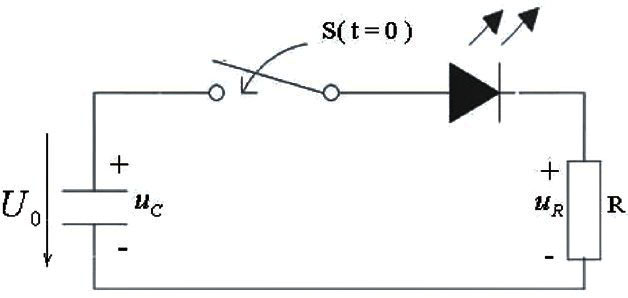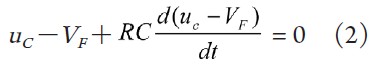 u0為穩(wěn)壓二極管VD的穩(wěn)定電壓,發(fā)光二極管的導(dǎo)通壓降為VF ,t ≥0時電容儲存的能量通過發(fā)光二極管和電阻釋放出來,在這段時間內(nèi)發(fā)光二極管發(fā)光,根據(jù)KVL可得: