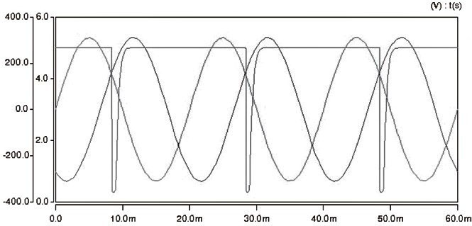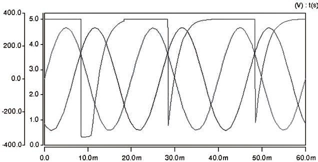 以上設(shè)計方案在Sabe r環(huán)境下進行了仿真驗證,仿真結(jié)果如圖5所示,其中兩正弦波為三相電源的其中兩相電壓,脈沖電壓為送至單片機外部中斷INT0的信號。從圖5可以清晰的看到,在自然換相點附近,產(chǎn)生了一組幅值為5V,脈寬約為2ms,頻率為50Hz的脈沖信號,而在自然換相點處,產(chǎn)生了一個近乎90度的下降沿,有利于單片機進行捕捉。改變時間常數(shù)τ可以改變脈沖電壓的脈寬,如圖5所示,在自然換相點處產(chǎn)生了一組幅值為5V,脈寬約為10mS,頻率為50Hz的脈沖信號。 圖5 為經(jīng)檢測電路得到的脈沖電壓,圖6為不同τ值檢測電路得到的脈沖電壓。