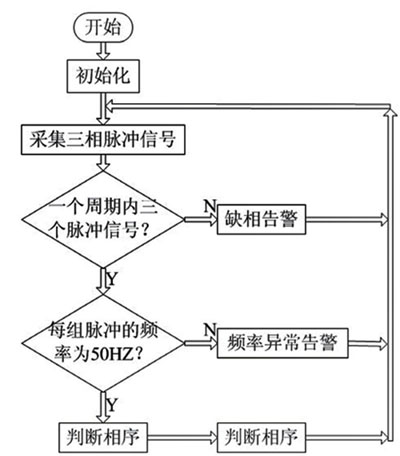 檢測電路得到的脈沖電壓信號送至Atmega16單片機進行處理,單片機的程序通過C 語言編制, 主程序流程如圖7 所示, 主要分為三個模塊: 缺相判定, 頻率正常判定和相序判定, 系統(tǒng)正常工作后,三個模塊循環(huán)執(zhí)行。