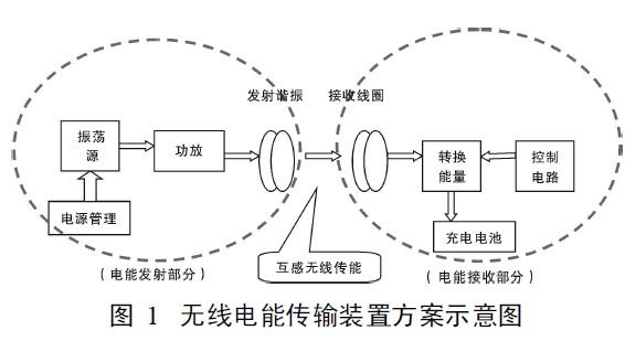 將直流電轉(zhuǎn)換成高頻交流電,然后通過沒有任何有有線連接的原、副線圈之間的互感耦合實(shí)現(xiàn)電能的無線饋送。基本方案如圖1所示。