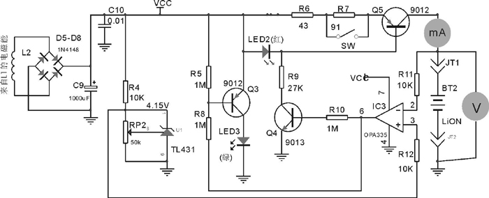 由R4,RP2和TL431構(gòu)成精密參考電壓4.15V(鋰離子電池的充電終止電壓)經(jīng)R12接到運(yùn)放IC的同相輸入端3。當(dāng)IC2的反相輸入端2低于4.15V時(shí)(充電過程中),IC3輸出的高電位一方面使Q4飽和從而在LED2兩端得到約2V的穩(wěn)定電壓(LED的正向?qū)ň哂蟹€(wěn)壓特性),Q5與R6、R7便據(jù)此構(gòu)成恒流電路I0=2-0.7R6+R7。另一方面R5使Q3截止,LED3不亮。