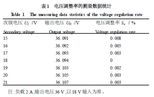 (4) 輸出電壓紋波Vpp。用交流調(diào)壓器設(shè)定U2 為18 V ,負(fù)載電壓為36 V ,電流為2 A 時(shí),用模擬示波器測(cè)量紋波電壓峰峰值。