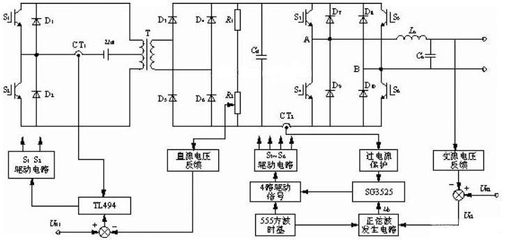 再經(jīng)過全橋DC/AC逆變電路,得到220V/50Hz交流電壓輸出。為保證系統(tǒng)可靠運行,防止主電路對控制電路的干擾,采用主、控電路完全隔離的方法,即驅(qū)動信號用光耦隔離,反饋信號用變壓器隔離,輔助電源用變壓器隔離等。