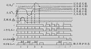 如工作電壓超出其欠壓設定值時,吸合工作觸點進入所設定的延時保護狀態(tài)(設定時間為0~30s)。待延時結(jié)束后,控制器工作觸點釋放,由接通狀態(tài)變至斷開狀態(tài),直至電壓重新回至正常電壓工作帶。在工作時序圖中,保護觸點狀態(tài)2、3即為欠壓保護工作狀態(tài)。