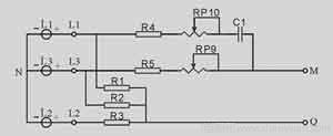 在保護器電源輸入端⑤、⑥、⑦串接相應的RC移相電路(R4、RP9、C11、RP10、R5、R3)。調(diào)整相應電位器RP9、RP10,使加至整流橋輸入端M、Q的電壓為確定值(在保護器工作電源處于額定電壓下進行調(diào)整)。如工作電壓有波動,則由相應RC移相電路使整流橋電壓輸入端電壓發(fā)生變化,從而使IC3A②端電壓Vcc也發(fā)生變化。在取樣電路中加入V1穩(wěn)壓管,則保證電壓檢測值不得超過V1穩(wěn)壓值。如超出,則IC3A中V③<V②,輸出①端為“0”,并使IC3B⑤端電平為“0”(C6經(jīng)R28放電,電平下降);同時,IC3B輸入端V⑤<V⑥(V⑥電平由R24、R23分壓取得),輸出端⑦亦為“0”,使IC2⑥端電平為“0”,產(chǎn)品處于保護狀態(tài)。