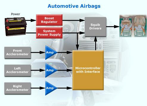 即使是小型的汽車目前都設(shè)有6個(gè)氣囊,而且所采用的安全標(biāo)準(zhǔn)要求極高。負(fù)責(zé)為氣囊充氣的是一款稱為爆管驅(qū)動(dòng)器(squib driver)的特別芯片,該芯片必須能夠在撞車的緊急關(guān)頭立即啟動(dòng)。按照圖1所示,氣囊系統(tǒng)由多個(gè)部分組成。