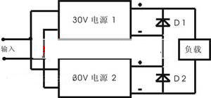 220V交流電壓經(jīng)整流和濾波后得到320V左右的直流電壓,加至電源模塊輸入端。單DC-DC模塊的最高輸出電壓一般為+48V,要得到+60V的直流輸出電壓,必須采用模塊串聯(lián)的方法得到。設(shè)計(jì)采用兩塊PH600S280-28 DC-DC模塊(調(diào)至+30V輸出),通過串聯(lián)得到+60V的輸出電壓,如圖1所示。