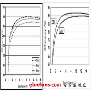Maxim電源部制作了一款基于MAX5051的隔離電源模塊,圖2是詳細(xì)的電氣原理圖。我們將該電源模塊與市場(chǎng)上流行的電流模式同步整流推挽電源模塊(這里我們稱(chēng)其為非定制模塊)進(jìn)行了比較,從所測(cè)試的效率曲線(xiàn)(圖3)可以看出,基于MAX5051的模塊效率明顯提高。輕載時(shí),比如1A輸出負(fù)載,MAX5051模塊電源的效率大于62%,而非定制模塊的效率則小于58%。在輸出功率為半載時(shí)(7.5A),MAX5051模塊效率為92%,非定制模塊效率是88%。滿(mǎn)功率負(fù)載時(shí),MAX5051模塊電源的效率仍比非定制模塊效率高出4%。從效率曲線(xiàn)對(duì)比,可以得出雙管正激電路能夠更好的滿(mǎn)足模塊電源高效率的要求。