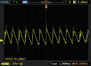 測試輸出電壓紋波時(shí),首先由工控機(jī)來控制程控電源輸出,其輸出能夠使電源進(jìn)入正常工作狀態(tài),然后控制程控電子負(fù)載使電源達(dá)到100%負(fù)載狀態(tài),再由多通道開關(guān)將DS1302CA示波器接入到電源的輸出端,通過工控機(jī)將數(shù)字示波器設(shè)置為直流耦合,使用1:1的探針輸入。另外,為了便于更好地觀察穩(wěn)定的紋波信號,可以打開示波器的“帶寬限制”。最后,將數(shù)字示波器測量出的紋波信號峰峰值上傳至計(jì)算機(jī)中存儲起來,便得到了該電源的紋波電壓,如圖4所示。