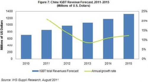據(jù)IHS iSuppli公司中國研究服務即將發(fā)表的一份報告,由于綠色能源與能源效率得到更多的重視,以及政府投資支持和嚴格的能源政策,2011-2015年中國絕緣柵雙極型晶體管(IGBT)市場銷售額的復合年度增長率將達13%。