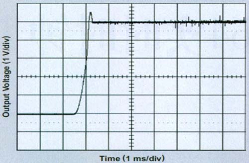 在一些典型的啟動(dòng)應(yīng)用中,TPS64203限流值慢慢上升,以提供限流的受控軟啟動(dòng)。在這種應(yīng)用中,限流電路和軟啟動(dòng)均無效;因此,啟動(dòng)浪涌電流會(huì)很大,而輸出電壓會(huì)稍稍過沖,如圖 4 所示。