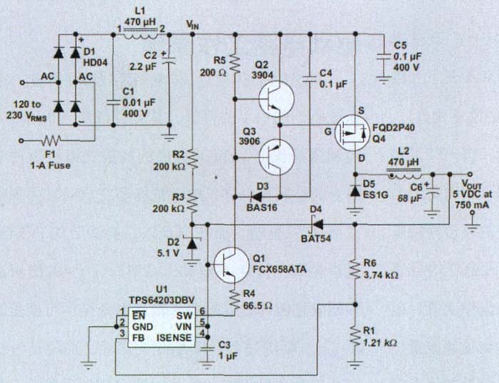 圖 1 顯示了完整的轉(zhuǎn)換器。整流器電路使用一個(gè)標(biāo)準(zhǔn)、快速開關(guān)整流器二極管橋接 (D1) 和一個(gè)LC濾波器(L1和C2),我們將對其余組件進(jìn)行更加詳細(xì)的介紹。