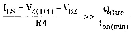 電容C4和二極管D3對驅(qū)動(dòng)電路的功能至關(guān)重要。通過選擇電阻R5來將12V柵極驅(qū)動(dòng)電平設(shè)置在整流器輸出電壓以下。二極管D3將電容C4限定在這一電平。特別是,當(dāng)U1的開關(guān)引腳輸出一個(gè)低信號來開啟功率FET時(shí),信號被電平位移到Q3的基極。晶體管Q3開啟,并快速地將Q4的柵—源電容CGS充電至 12V。如果沒有C4和D3的話,關(guān)閉Q4會(huì)讓Q3成為一種漏極接地的昂貴的高壓雙極型晶體管。當(dāng)U1的開關(guān)引腳輸出一個(gè)高信號來關(guān)閉功率FET時(shí),該信號被電平位移至Q2的基極。Q2開啟,有效地將Q4的柵極與輸入電壓連接。在沒有起到本地電源作用的電容C4的情況下,晶體管Q2和Q3無法提供快速(且因此而高效地)上拉或下拉Q4柵極電容所必需的快速電流峰值,注意到這一點(diǎn)很重要。另外,由R4設(shè)定的電平位移器電流ILS必須足夠高,以在ton(min) 期間移動(dòng)Q4的柵極電荷QGate。也就是說: