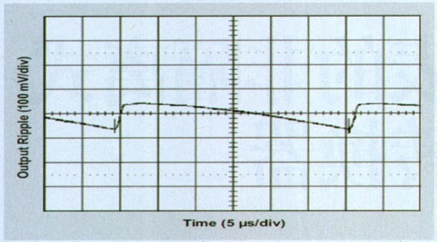 相對較高的K值最小化了電感值,并且經(jīng)證明是可以接受的,因?yàn)檫@種特殊應(yīng)用的穩(wěn)態(tài)輸出紋波要求小于0.02 × VOUT,即高負(fù)載時(shí)的100mVPP。磁滯后,TPS6420x控制器一般在輸出電壓有一些紋波時(shí)工作效果最佳,建議使用至少 50mΩ ESR的輸出電容可產(chǎn)生ΔVPP(ESR) = ΔIL × RESR的紋波電壓,其一般遠(yuǎn)超出電壓紋波的電容分量。圖2顯示了該應(yīng)用測得紋波。