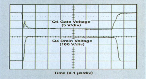 圖 3 一個(gè)開關(guān)周期的Q4柵極和漏極電壓