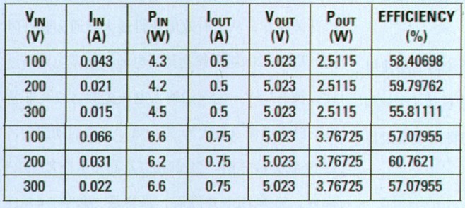 電容C4值設(shè)定大于Q4的柵極電容,但其必須足夠小,以便在更短控制器最小導(dǎo)通與斷開時(shí)間期間能夠得到再充電。圖3顯示了300V和500mA負(fù)載輸入電壓下,一個(gè)開關(guān)周期的柵極和漏極導(dǎo)通/斷開時(shí)間。表1顯示了測得的轉(zhuǎn)換效率。