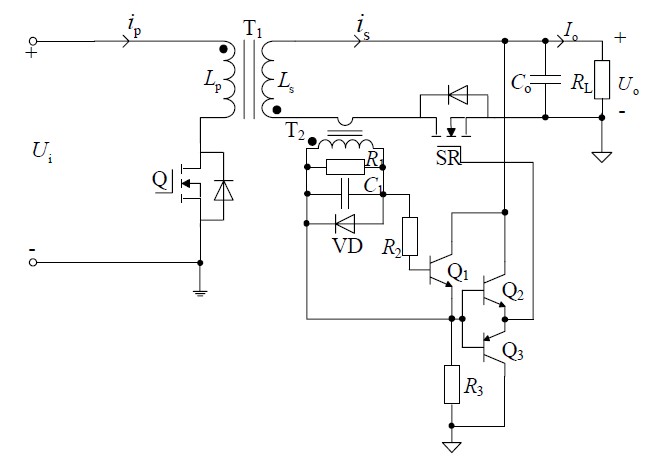 該驅(qū)動電路的基本工作原理:電流互感器T2 與次級同步整流管SR 串聯(lián)在同一支路,用來檢測SR 的電流。當有電流流過SR 的體二極管,則在電流互感器的二次側(cè)感應(yīng)出電流,該電流通過R1 轉(zhuǎn)變成電壓,當電壓值達到并超過晶體管Q1 的發(fā)射結(jié)正向電壓時,Q1 導(dǎo)通,達到二極管VD 導(dǎo)通電壓時,VD 導(dǎo)通對其箝位。晶體管Q1 導(dǎo)通后,輸出電壓通過圖騰柱輸出電路驅(qū)動SR 開通。當SR 中的電流在電流互感器二次側(cè)電阻R1 上的采樣電壓降低到Q1 的導(dǎo)通閾值以下時,Q1 關(guān)斷,SR 關(guān)斷。