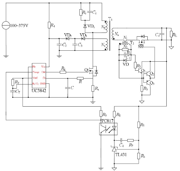 反激變換器應(yīng)用廣泛,采用同步整流技術(shù)能夠很好的提高反激變換器效率,同時為使同步整流管的驅(qū)動電路簡單,采用分立元件構(gòu)成驅(qū)動電路。本文詳細分析了同步整流反激變換器的工作原理和該驅(qū)動電路的工作原理,并在此基礎(chǔ)上設(shè)計了100V~375VDC 輸入,12V/4A 輸出的同步整流反激變換器,工作于電流斷續(xù)模式,控制芯片選用UC3842,對設(shè)計過程進行了詳細論述。通過Saber 仿真驗證了原理分析的正確性,證明該變換器具有較高的變換效率。