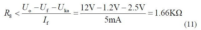 TL431 正常工作時需要陰極至陽極電壓Uka 大于2.5V,PC817 二極管正向?qū)▔航礥f為1.2V。所以: