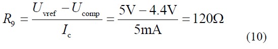 式中Uvref 為芯片8 腳電壓5V, U comp 為芯片1 腳電壓,計算時取系統(tǒng)穩(wěn)定時1 腳電壓最大值。