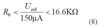TL431 參考輸入端電壓ref U 為2.5V,電流為1.5μA,為了避免此端電流影響分壓比和避免噪聲的影響,通常取流過電阻R6 的電流為參考輸入端電流的100 倍以上,所以: