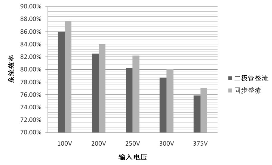 仿真結(jié)果與本文對同步整流反激變換器和同步整流管驅(qū)動電路的工作原理分析一致。同時仿真結(jié)果證明,該驅(qū)動電路可以很好實現(xiàn)同步整流功能,采用同步整流技術(shù)可以較好提高傳統(tǒng)反激變換器的效率。輸入電壓100V,滿載時,變換器效率最高為87.7%。