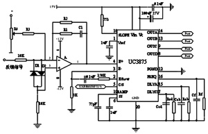PWM移相控制是通過UC3875的誤差放大器來實現(xiàn)的,在UC3875的4角上接PI調(diào)節(jié)器,利用電壓傳感器將輸出電壓與給定基準電壓相比較,從而控制A、B與C、D之間的相位,最終調(diào)整波形占空比,使電源穩(wěn)定在預(yù)定值上。A/B、D/C兩個半橋,可單獨進行導(dǎo)通延時(即死區(qū)時間)的控制,在該死區(qū)時間內(nèi)確保下一個功率開關(guān)器件的輸出電容放電完畢,為即將導(dǎo)通的開關(guān)器件提供電壓開通條件。圖3所示是本設(shè)計的控制電路圖。